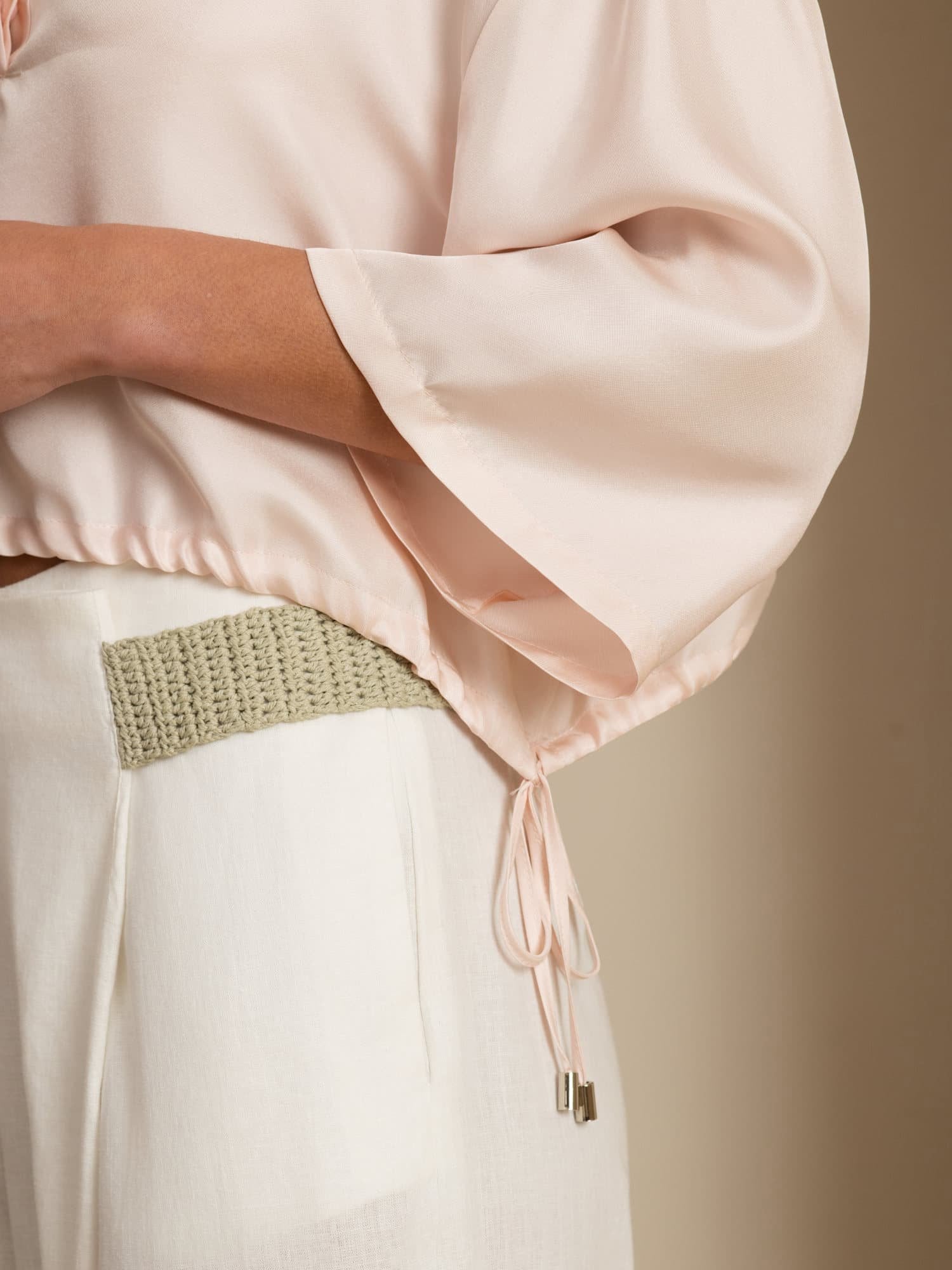 Hergestellt aus 100% reiner Maulbeerseide, bietet diese Bluse einen luxuriösen natürlichen Glanz und ein glattes, leichtes Tragegefühl. Die lässige Passform und die fallende Schulter schaffen eine mühelose, moderne Silhouette, während der Reverskragen einen raffinierten strukturellen Akzent setzt. Der verstellbare Kordelzug am Saum ermöglicht es Ihnen, die Croplänge und -form individuell anzupassen, und das Pull-on-Design macht das Anziehen einfach. Atmungsaktiv und elegant weich, wechselt diese Cropbluse nahtlos von lässiger Tageskleidung zu Abendausflügen. Kombinieren Sie sie mit hochtaillierten Röcken oder Hosen für einen vorteilhaften, trendigen Look.